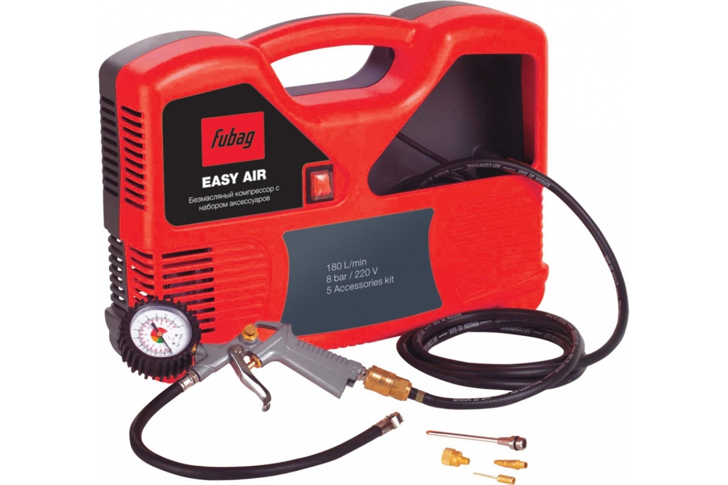 Fubag Easy Air - переносной безмасляный компрессор, предназначенный для обеспечения пневмоинструмента чистым сжатым воздухом. Широко применяется в ремонте и домашнем применении. В корпусе компрессора Easy Air Fubag есть отсек для хранения пневмоинструмен