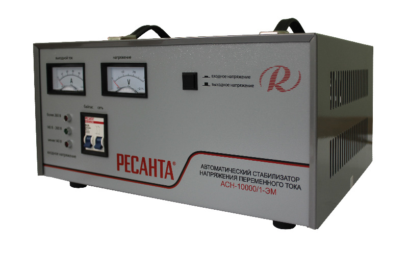 Однофазный стабилизатор напряжения Ресанта АСН 10000/1-ЭМ используется для защиты от перепадов напряжения и короткого замыкания высокоточного оборудования суммарной мощностью до 10 кВт. Встроенные фильтры предотвращают искривление частотной синусо