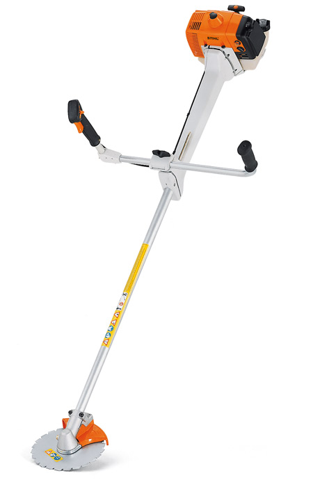 Мощный кусторез с пильным диском для удаления сучковатых кустарников и тонких деревьев. Удобный наплечный ремень.