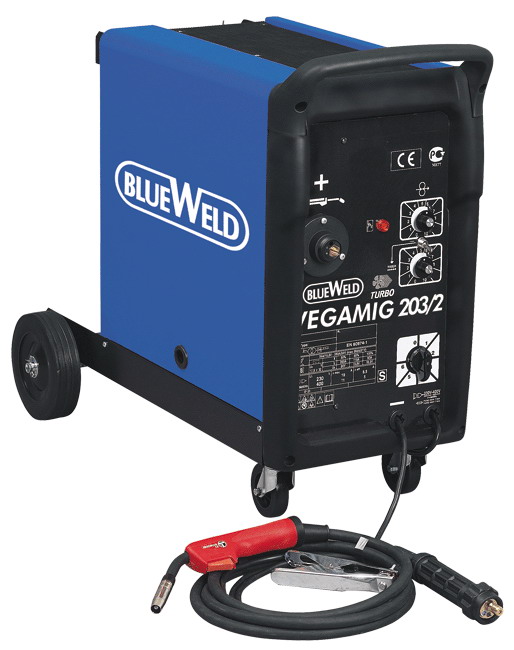 Однофазный/Трехфазный сварочный полуавтомат BlueWeld Vegamig 203/2 с воздушным охлаждением для сварки электродной проволокой в среде защитного газа методом MIG-MAG.С термозащитой и ступенчатой регулировкой сварочного тока.